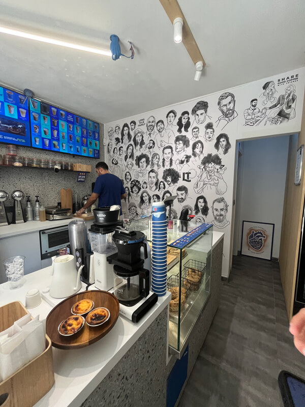 The café features a menu of unique beverages like the Lavender Latte and Strawberry Cold Foam Latte, crafted from Greek-roasted specialty coffee beans. Accompany your drink with treats such as banana bread, New York-style bagels, and Pastel de Nata.