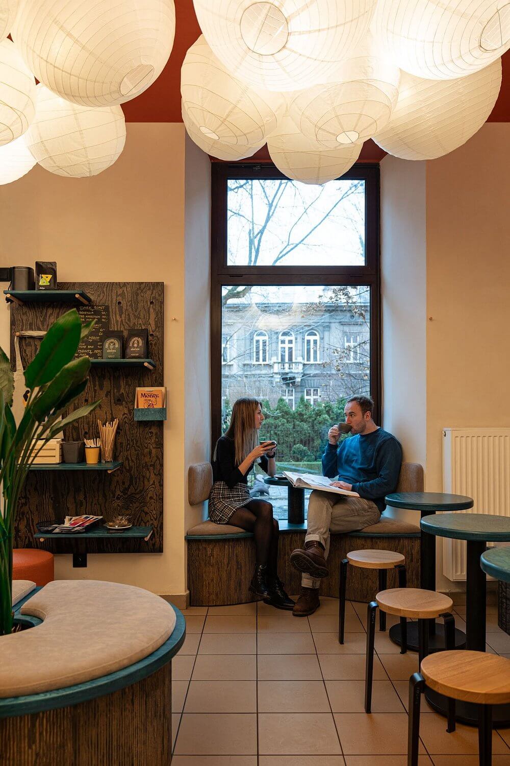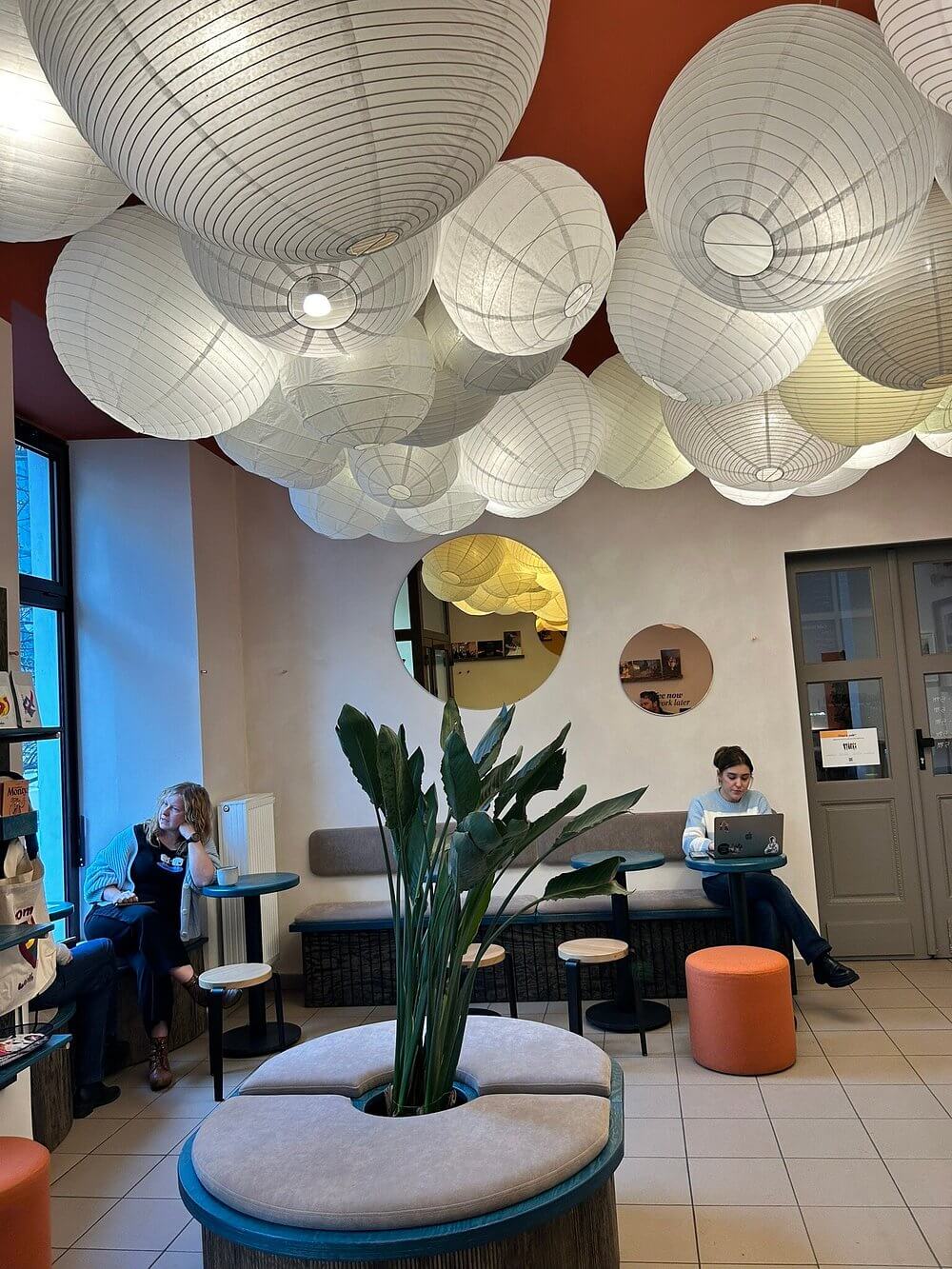 The interior exudes a minimalist charm, with clean lines and a neutral color palette that creates a calming environment. Large windows allow natural light to flood the space, enhancing the inviting ambiance. The seating arrangement includes both communal tables and individual spots, catering to groups and solo visitors alike.